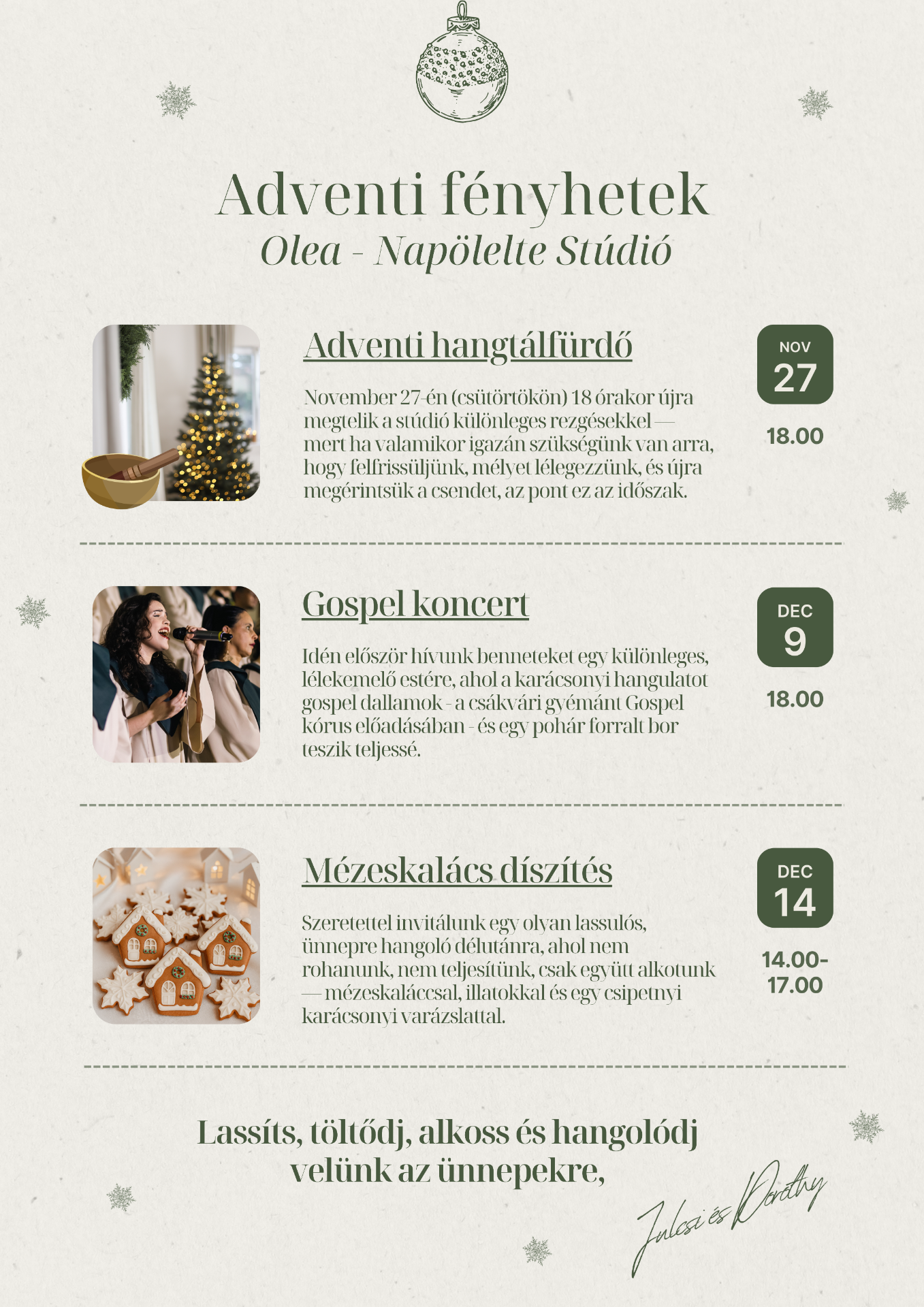 Szeretettel várunk benneteket legközelebbi eseményeinkre, melyek mind-mind az ünnepre való hangolódásra, a lassításra és a töltődésre épülnek.